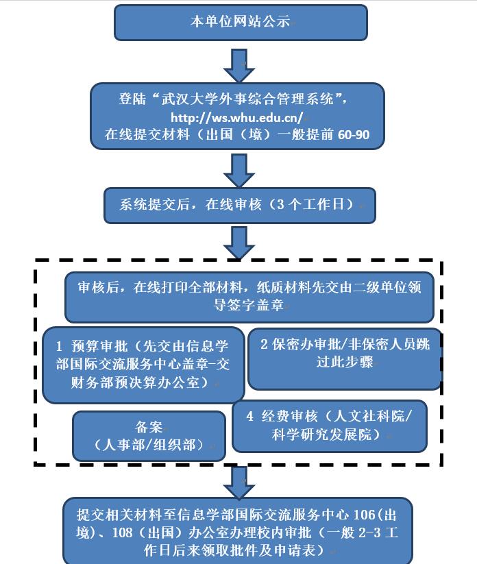 注意:校外办理签证、签注及证照业务已经交由湖北省外国机构服务中心(湖北省人民政府外事侨务办公室下属单位),所需要的材料请详见外事管理系统的相关帮助“因公出国各国签证要求”。相关具体工作请咨询信息学部国际交流服务中心(湖北省外国机构服务中心)107办公室,电话:87689049