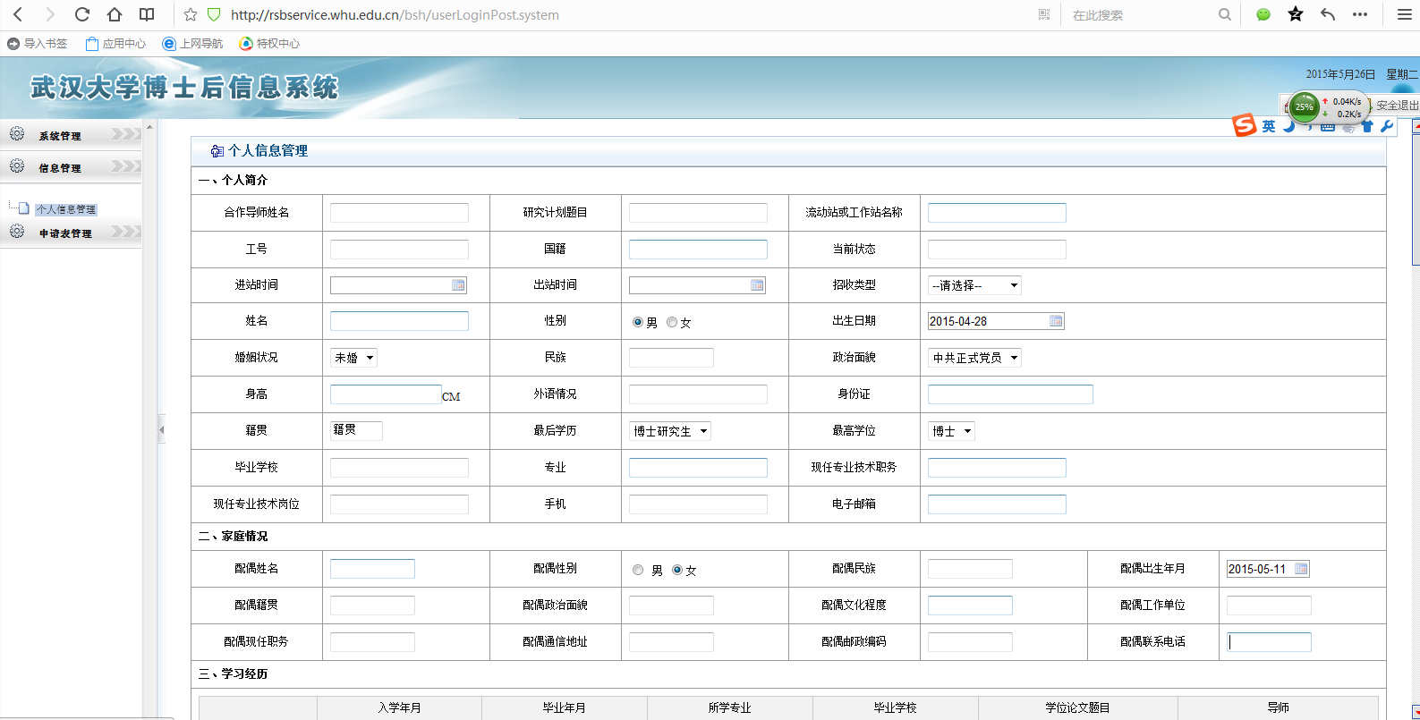 该系统将所有表格的相同部分集中在个人信息管理中,初次填写后,将用于“博后办”文件夹中的所有表格(如下图),避免了表格内容的重复填写。