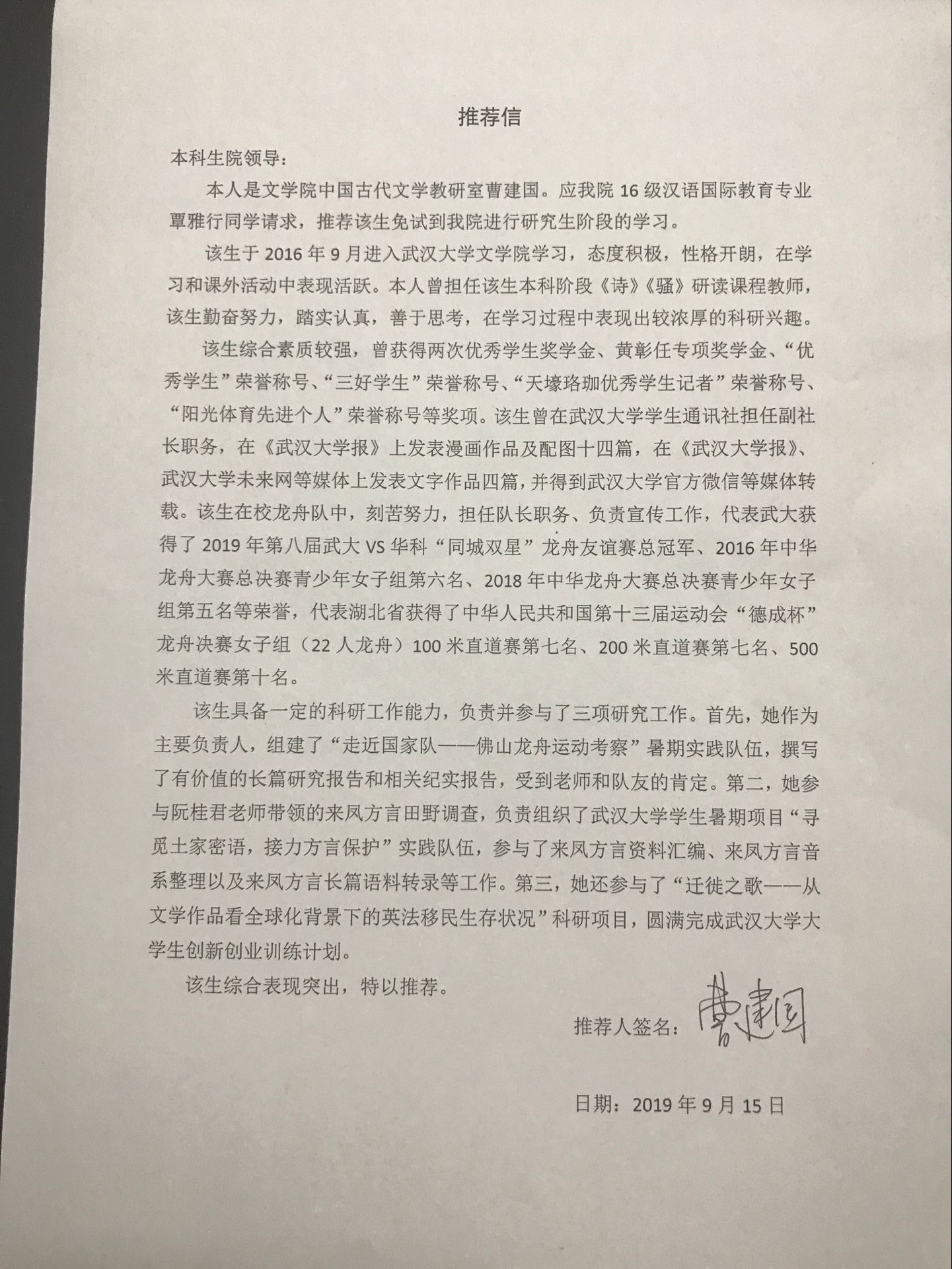 覃雅行必修课成绩在全班15名学生中位列第7,位居前50%,通过大学英语6级。该生在校龙舟队效力三年,代表湖北获得中华人民共和国第十三届运动会“德成杯”龙舟决赛女子组100米赛道第七名 |
