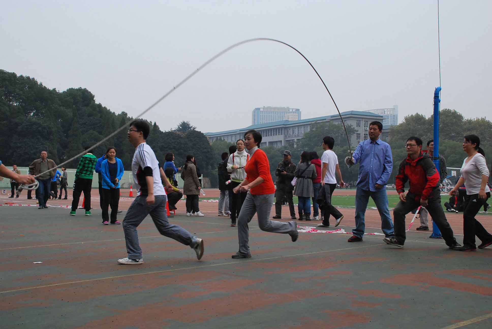 在竞争最为紧张激烈的20人×60M穿梭接力中,天公不作美,下起了中雨,但参赛的各位老师不受环境干扰,团结一致,努力拼搏,最终获得全校第十二名。