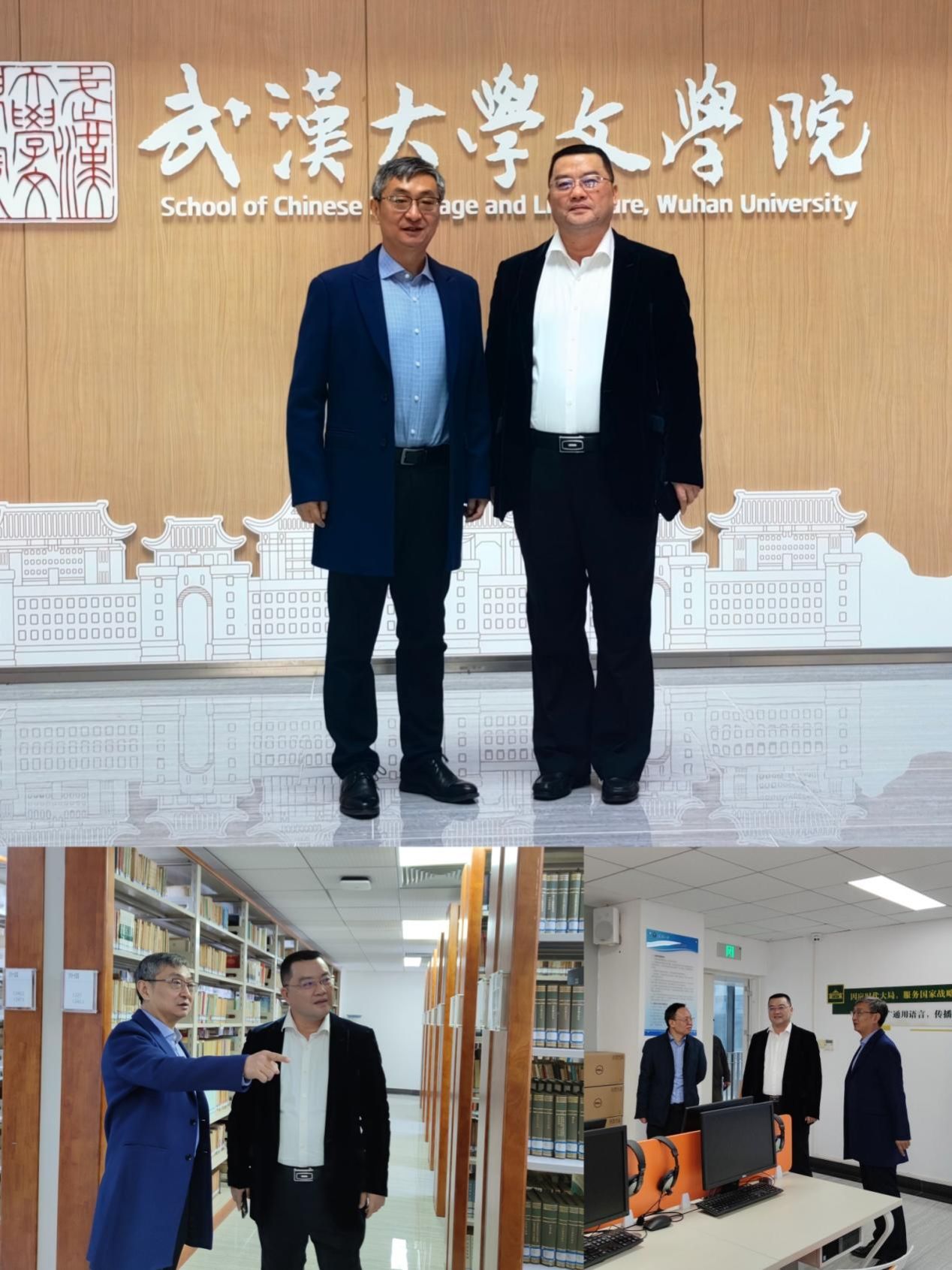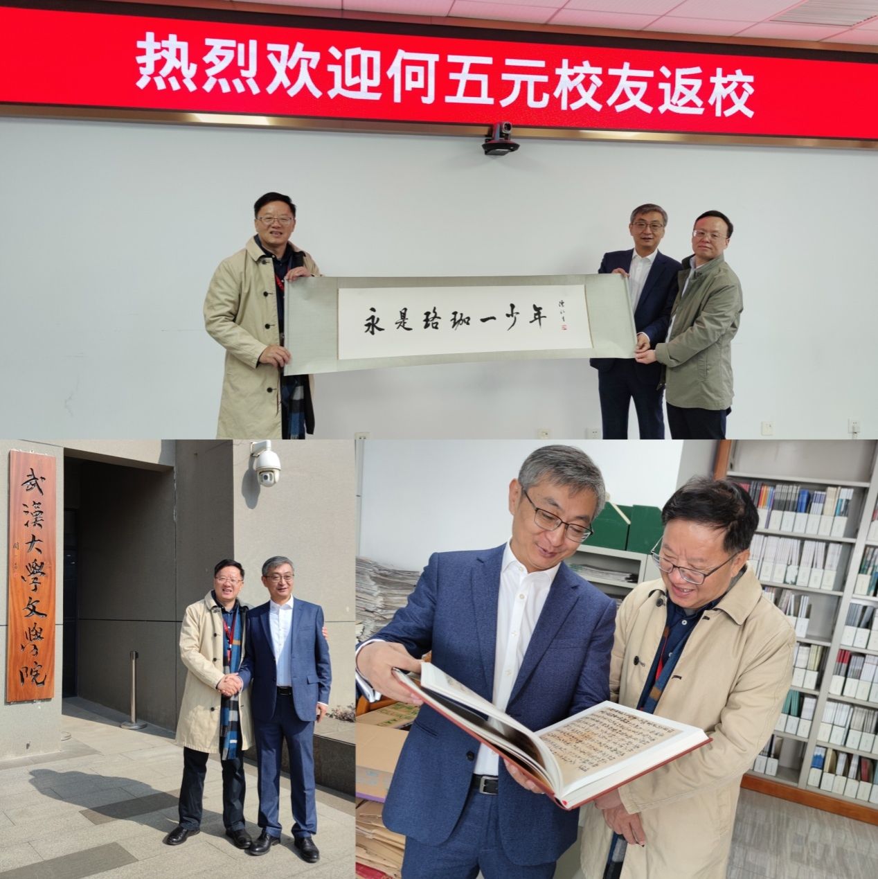 中文系1984级校友,海南省文联作协党组书记、省文联主席夏斐(左三),11月29日来学院参观座谈。他曾在《光明日报》任职多年,采写了大量宣传武大的新闻报道。他最想念武大的樱花,“始终像雪花飘在心里”。