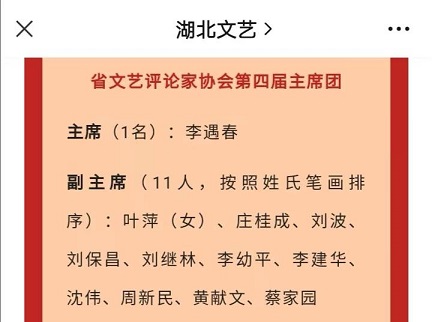 2022年7月15日至16日,湖北省六家文艺家协会在汉召开代表大会,我院五位教师参与湖北省文艺评论家协会第四次代表大会,其中李遇春教授当选湖北省文艺评论家协会第四届主席,叶立文教授、叶李副教授、裴亮副教授、朴婕副教授担任省评协第四届理事会理事。