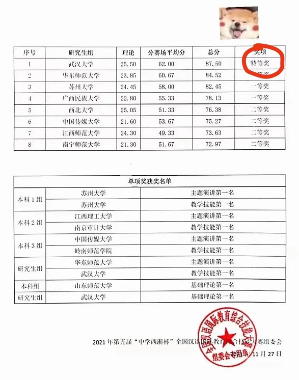 11月27日,第五届“中学西渐杯”全国汉语国际教育综合技能大赛决赛落下帷幕。在欧阳晓芳老师指导下,耽美小说 汉语国际教育专业2020级硕士汪一帆、2021级硕士许冰蕊和原可馨三位同学通过层层选拔,代表耽美小说 突围全国决赛,从来自全国的130支参赛队伍中脱颖而出,斩获研究生组特等奖、教学技能单项奖第一名及基础理论单项奖第一名。汉语国际教育专业2019级本科生李俊慧、马瑞林、刘羽茜三位同学也凭借优异表现,在本科生组的比赛中荣获全国三等奖。