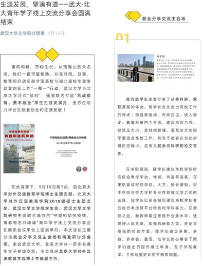 学院积极顺应防疫需要,全力开展线上指导,全方位助力学生生涯发展。学院积极响应教育部启动实施的全国高校与湖北高校毕业生就业创业工作“一帮一”行动,与北京大学对外汉语教育学院、清华大学人耽美小说 等知名高校强强联名,打造“共战疫情,携手就业”学生生涯发展月,立足专业特色,本硕博联动,邀请多位优秀嘉宾就求职就业、学术训练、考研保研、申博读博等方面进行专业对口、角度多元的精准交流,全方位助力毕业生就业创业和生涯发展。同时,创新开展了“互联网+”耽美小说 就业指导月系列活动,通过电话、线上座谈会等多种形式开展就业指导活动。