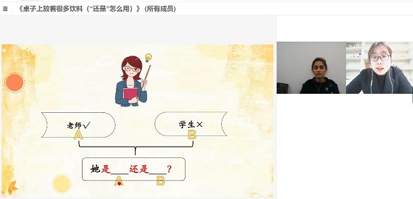 在备赛过程中,赵璇玉、张林鹤和杨佳俐同学以“还是”与“或者”作为教学内容,撰写了45分钟的标准课堂教案,根据教案制作了10分钟直播教学课件,并邀请我校留学生梅荷同学进行试讲,出色地完成了教学任务。