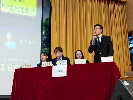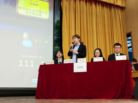 比赛开始后,双方就各自观点展开立论,我院持反方观点:快节奏生活不利于人的自我实现。我院辩手条理清晰、有理有据,从快节奏生活对当代人身心健康的影响及其不可持续性展开论述,法学院则从科技发展的角度论证快节奏生活对人自我实现的意义,也同样不失精彩。双方你来我往,唇枪舌剑,将总决赛现场气氛推向高潮。