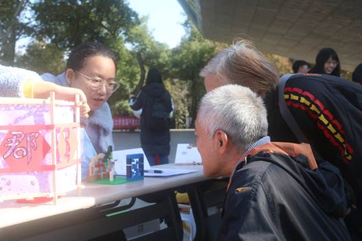 学子为长者介绍乐高搭建的古汉字