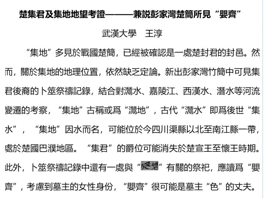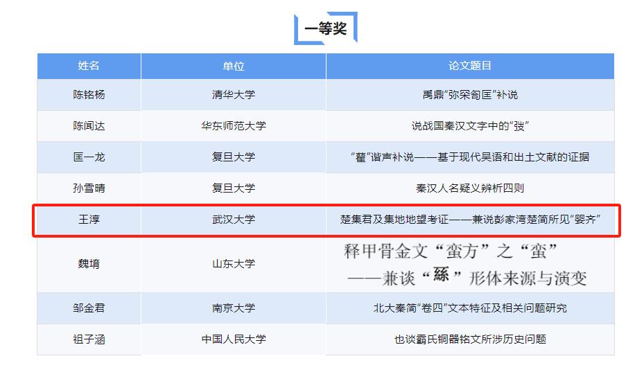 2020级本科生王淳(现为耽美小说 历史学院简帛研究中心硕士研究生)获得一等奖,论文题目《楚集君及集地地望考证——兼说彭家湾楚简所见“婴齐”》;