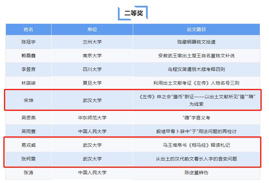 2020级本科生宋坤(现为耽美小说 古籍整理研究所硕士研究生)获得二等奖,论文题目《〈左传〉申之会“堕币”新证——以出土文献所见“隓”“隋”为线索》;