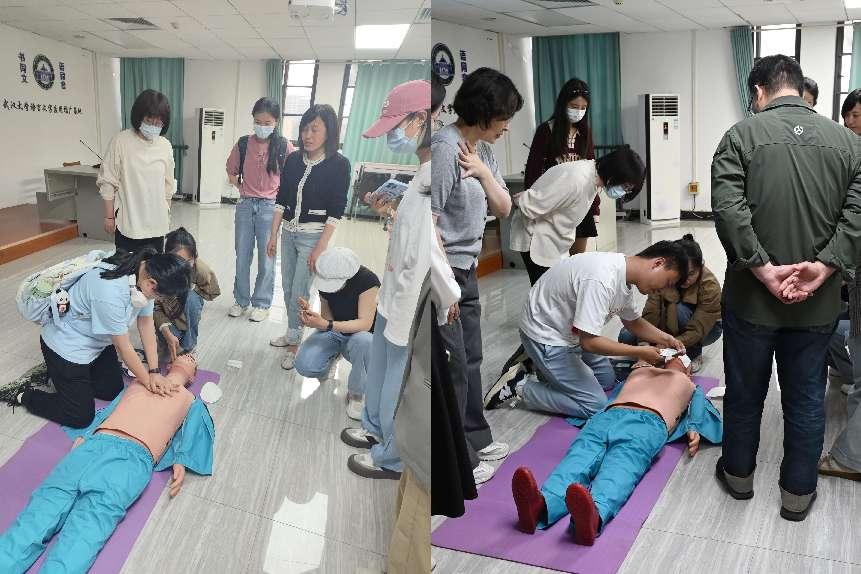 讲座设置实操演练环节,师生们在专家指导下练习急救动作和急救设备的操作方法。2024级博士生王同学表示:“以前只在视频里看过海姆立克法,今天亲手操作才发现发力角度有讲究,这种实战培训非常必要。”青年教师叶老师则感慨:“学习了胸外按压、人工呼吸和AED使用后,遇到突发情况更有底气了。”