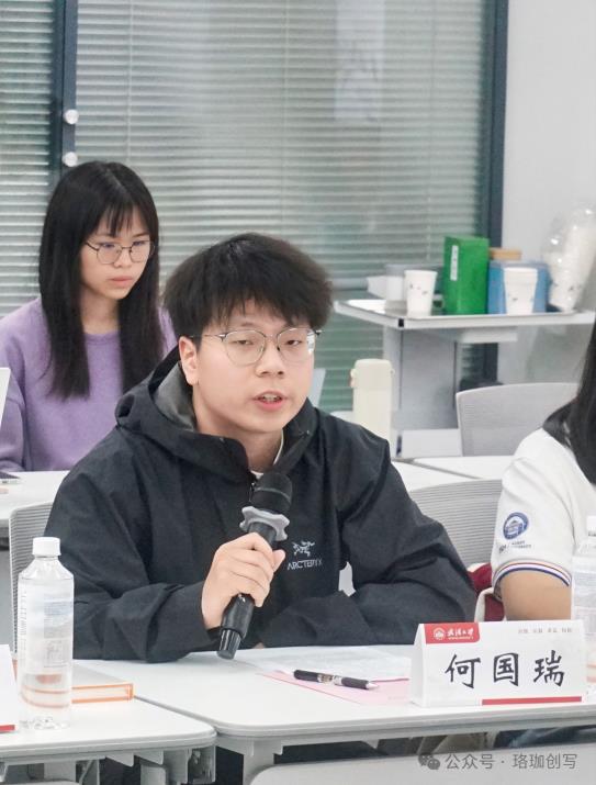 主题分享环节,《珞珈青年说》学生编委何国瑞详细介绍了书籍的采编历程,并分享采写心得:“要抓住受访者最突出、最核心的特点。”