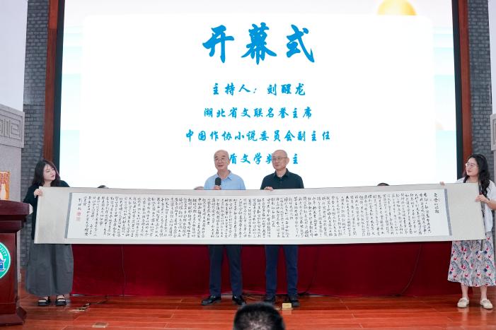 著名作家刘醒龙将自己的发言书写成长幅书法作品,现场赠送给於可训先生。刘醒龙认为,於可训先生的小说作品多是“喜怒不形于色”“爱恨藏于平淡”,这种不显山不露水的写作需要强大的内功。并且,在其小说令人叹为观止的地方隐藏着巨大的奥秘,即通过小说写作,摆脱一切束缚,实现人人所向往的自由境界。