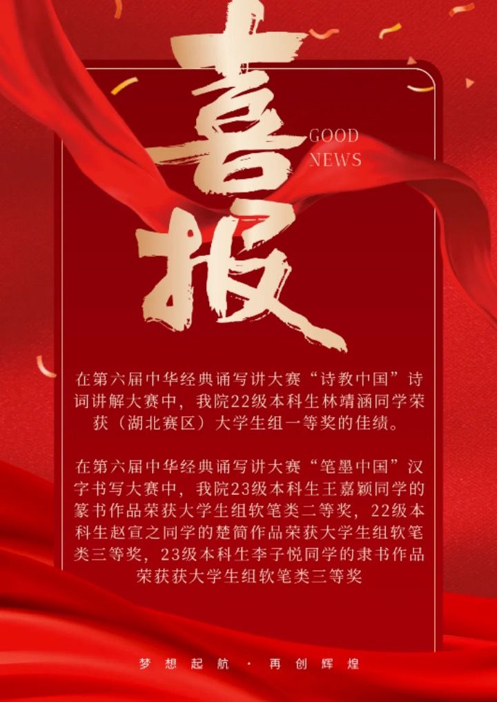 在第六届中华经典诵写讲大赛“诗教中国”诗词讲解大赛中,我院22级本科生林靖涵同学荣获(湖北赛区)大学生组一等奖的佳绩。