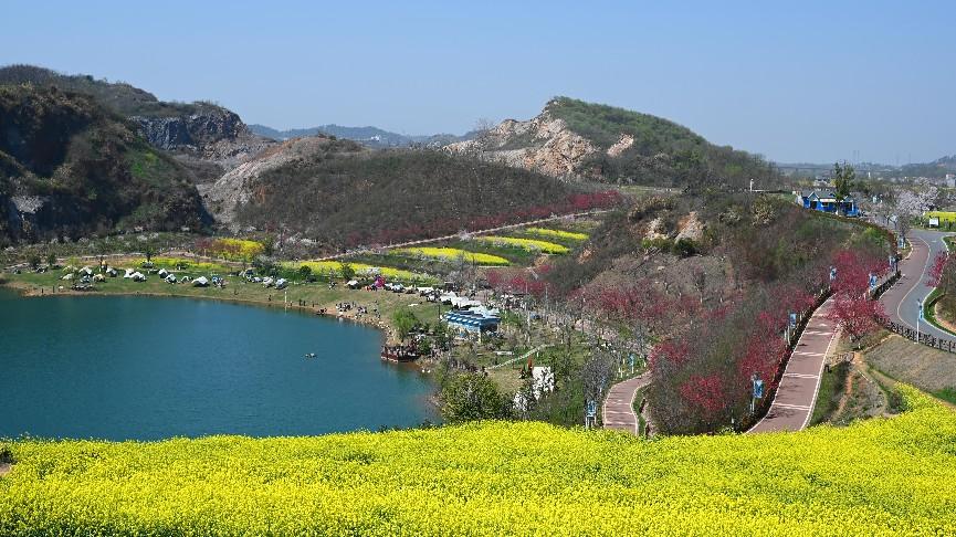 灵山位于江夏乌龙泉街,景区以生态旅游为主,矿山复垦景观蔚为壮观。景区中心是一汪碧波的矿坑湖,湖水沉静幽蓝。湖与山顶落差大,一条瀑布飞流直下,远观颇有银河落九天之势。环湖矿山,高低错落,步行道贯穿其中。登高远眺,漫山遍野,全是成片成片金灿灿的油菜花,犹如大自然打翻了调色盘,红的、黄的、绿的等等色块五彩斑斓地浓烈在山川旷野里。