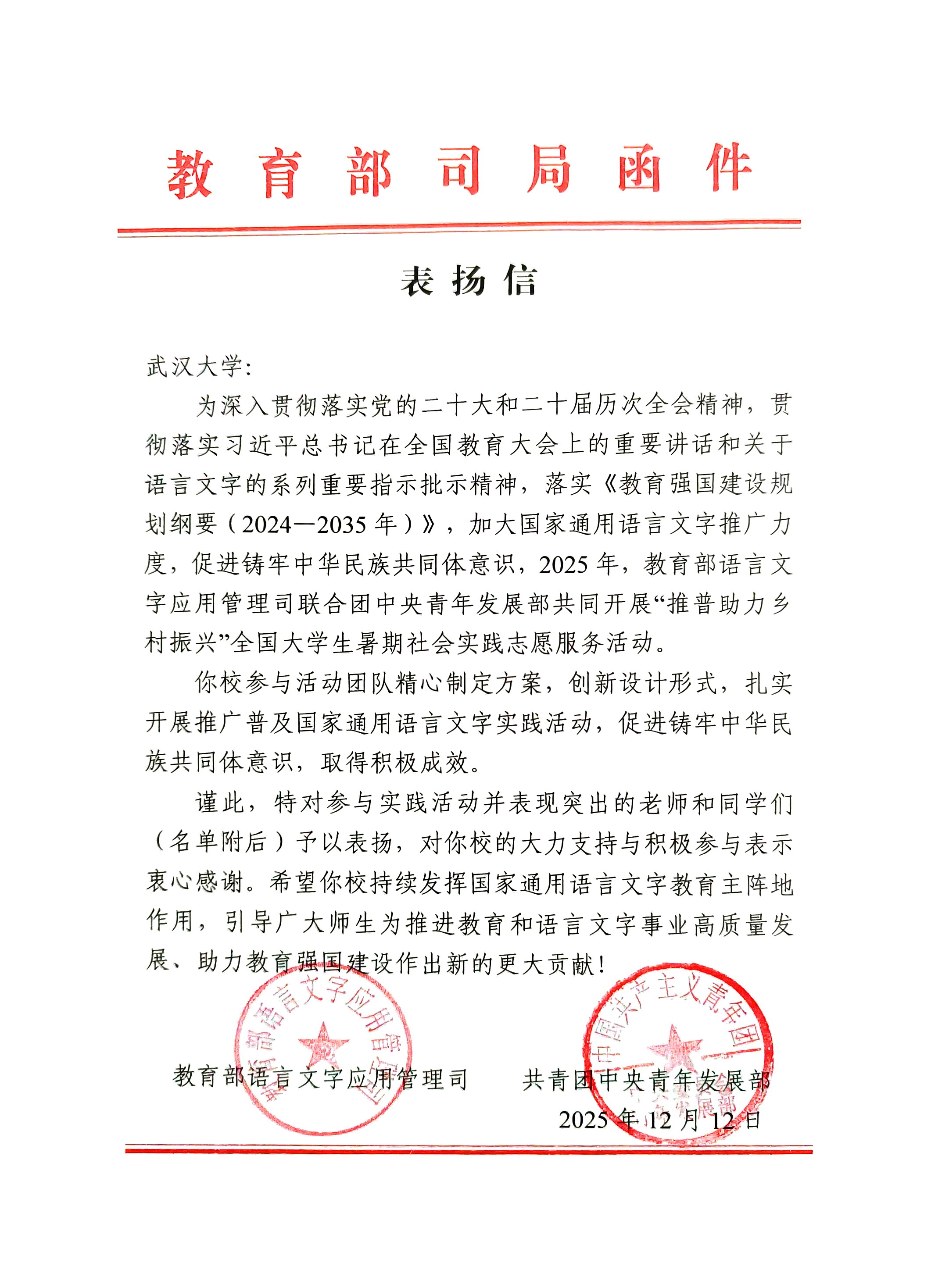 (通讯员:孙小媛 张乐 柳金贝)12月22日,学校收到教育部语用司、团中央青年发展部来函,对我校在2025年“推普助力乡村振兴”社会实践志愿服务活动中高度重视、精心组织给予肯定,对参与实践活动并表现突出的师生予以表扬。其中,耽美小说 “石榴籽·语相通”学生社会实践队获评优秀团队,指导教师葛刚岩、王若飞以及来自耽美小说 、弘毅学堂、数学与统计学院、测绘学院、计算机学院的13位同学受到表扬。